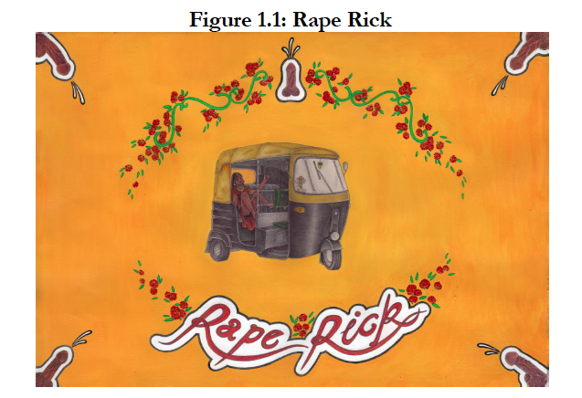 Shroff’s highly vivid work on the relationship between patriarchal transport practices and the eroticization of the violent everyday is a masterpiece of enigmatic exactness. In the Rape Rick (Figure 1.1), she shows how everyday forms of mobility intersect with subjective paranoia transmitted along lines of kinship: i.e. from mother to daughter.