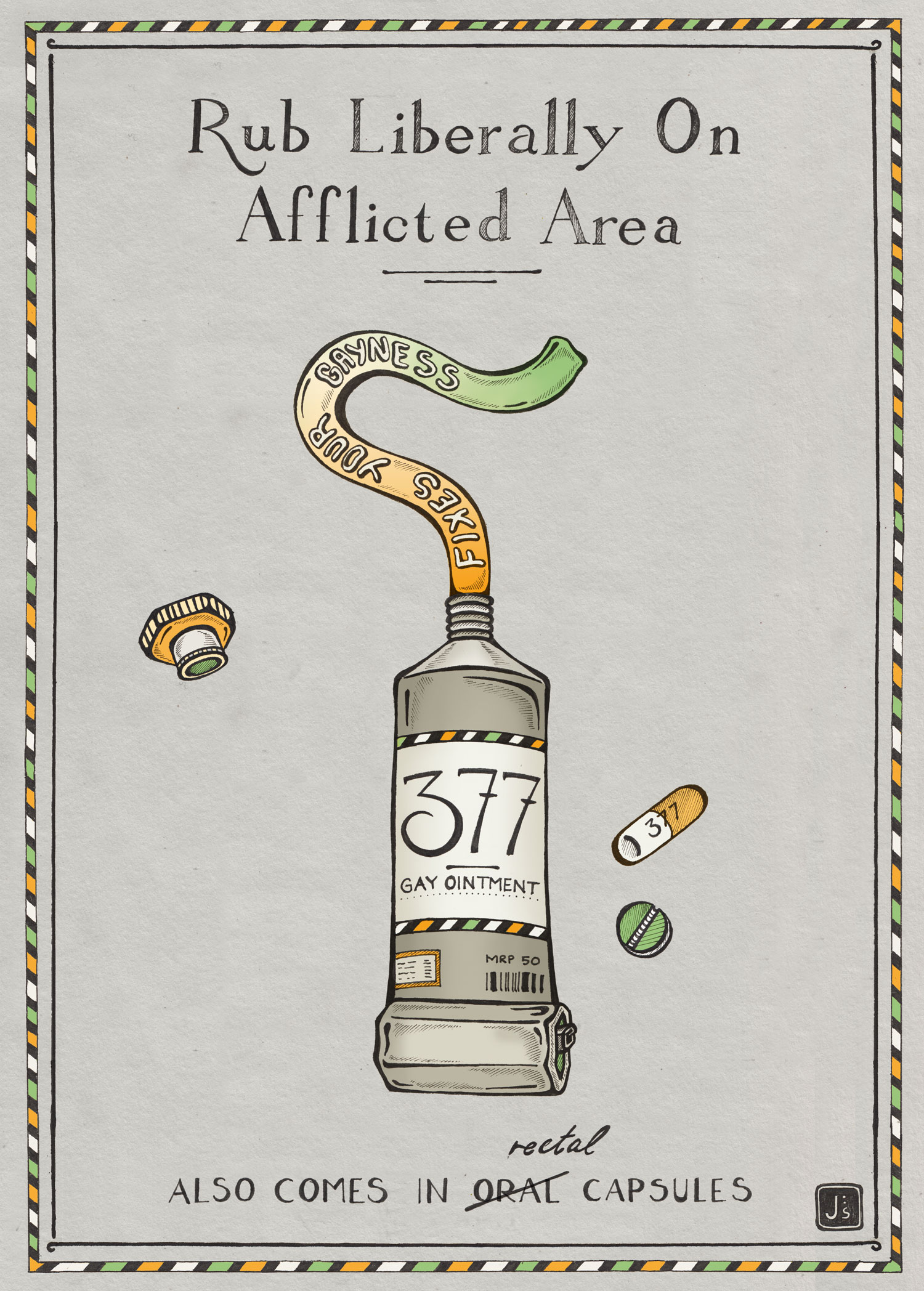 377 is a colonial law that still remained part of Indian law that makes homosexually illegal. The Indian supreme court, at the time of the creation of this poster, refused to review the decision not to repeal section 377.