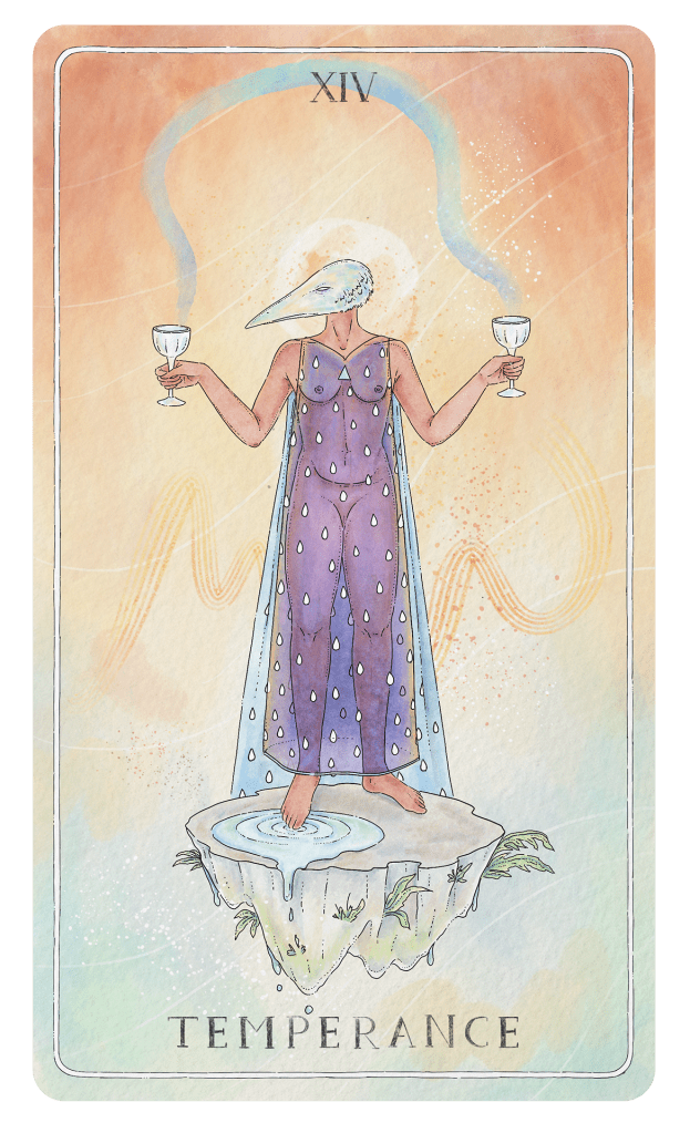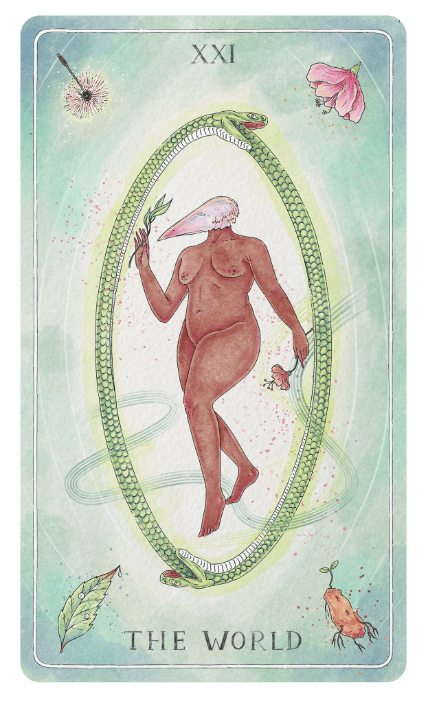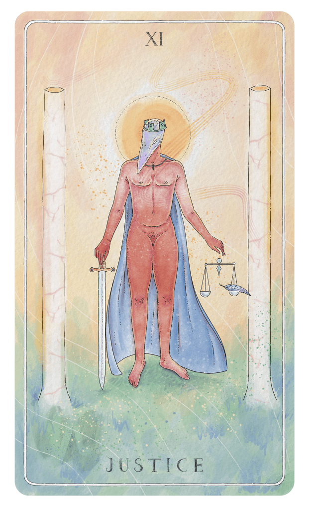 These cards feature bird people, to help soften or remove some of the overt gender binary and religious symbolism from the Pamela ‘Pixie’ Rider Waite tarot, which is largely considered the ‘classic’ tarot card deck.