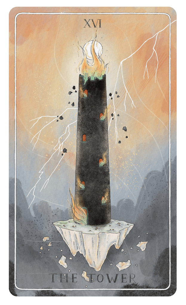 Upright: Danger, crisis, sudden change, unforeseen catastrophe, calamity, disgrace, deception, ruin, upheaval, chaos, revelation, awakening