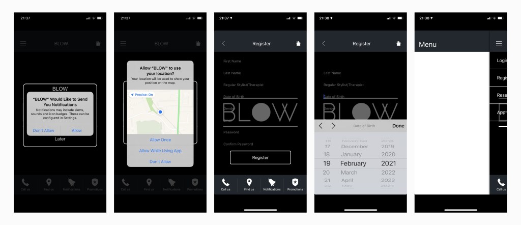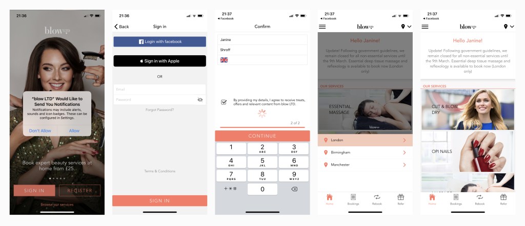 - Result: UI/UX for a customer blow dry service where you can either book for a blow dry at home or in the salon.