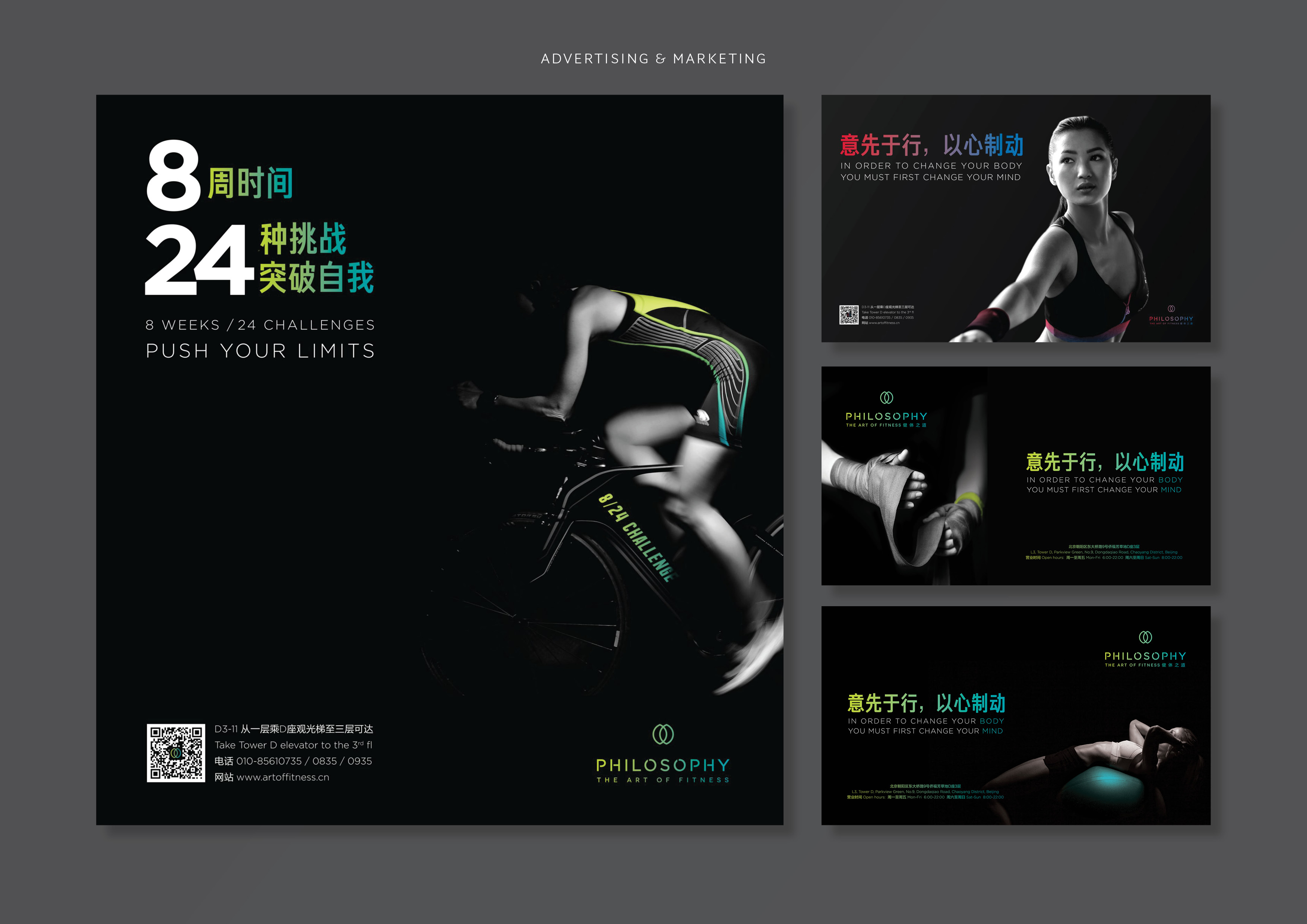 The campaign and creative style was tailored to reflect the modern brand values, avoiding cliché imagery and the very crowded design sensibility of usual gym advertising in China, to set Philosophy apart from the competitors.