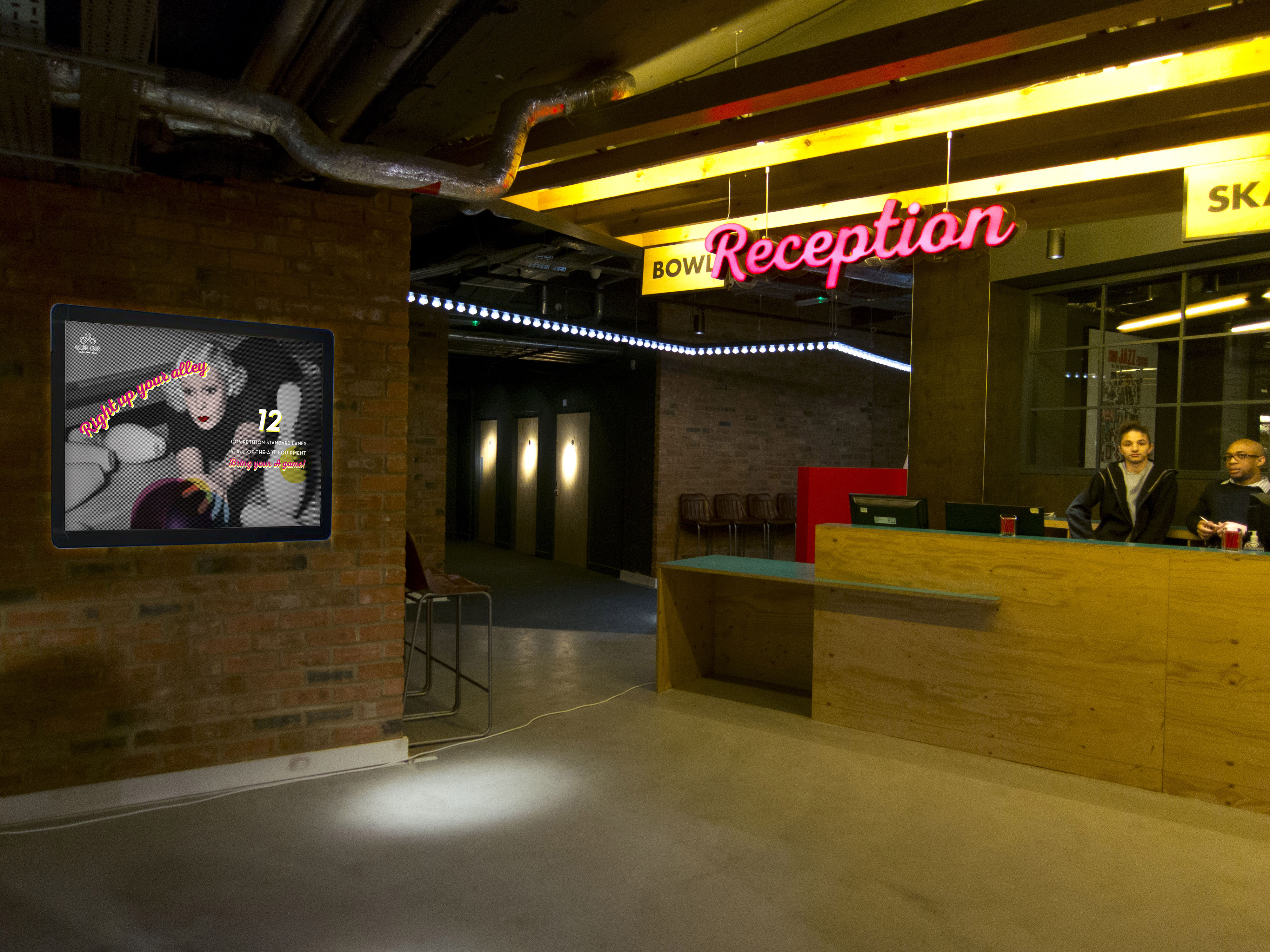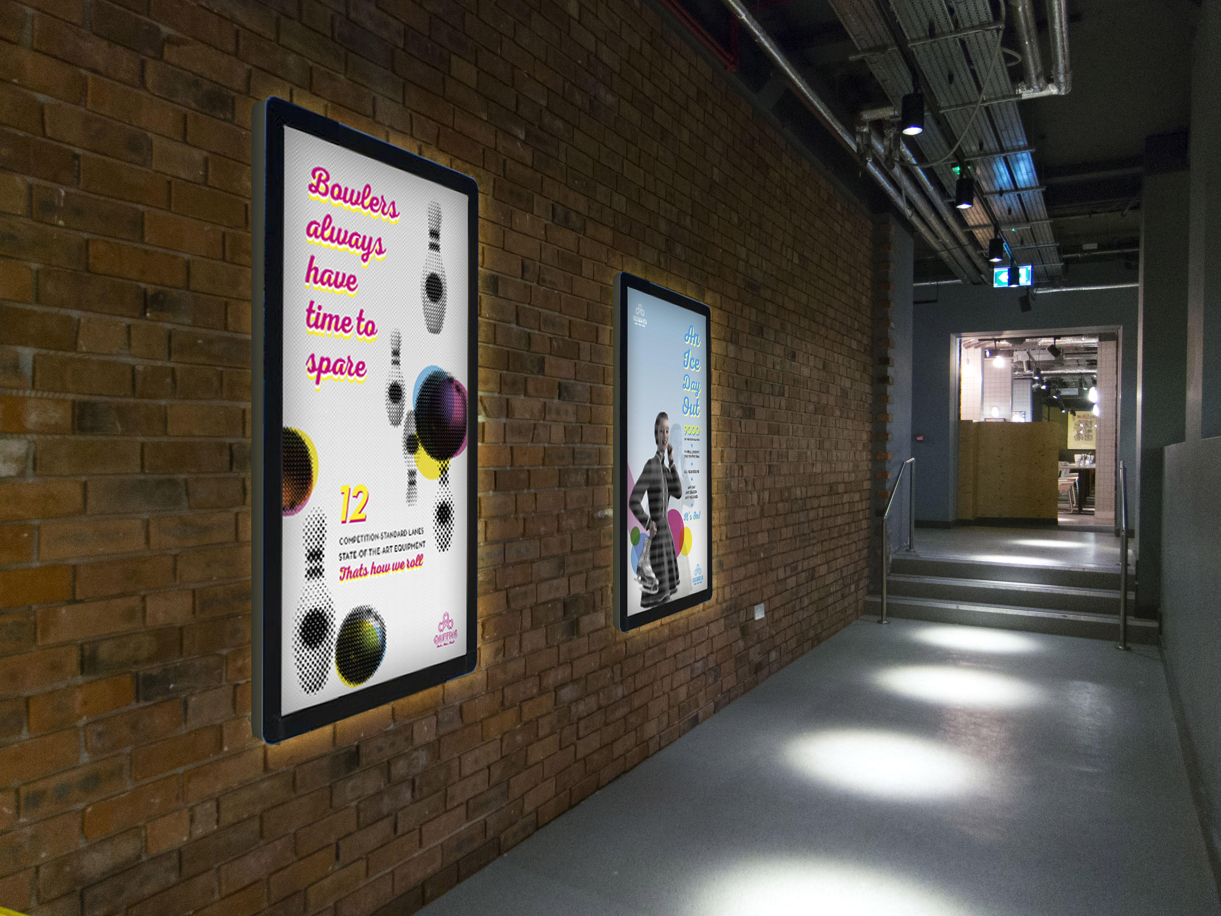 Light box poster designs for Queens bowling alley and ice rink in west London, inspired by the venue’s retro look & feel.
