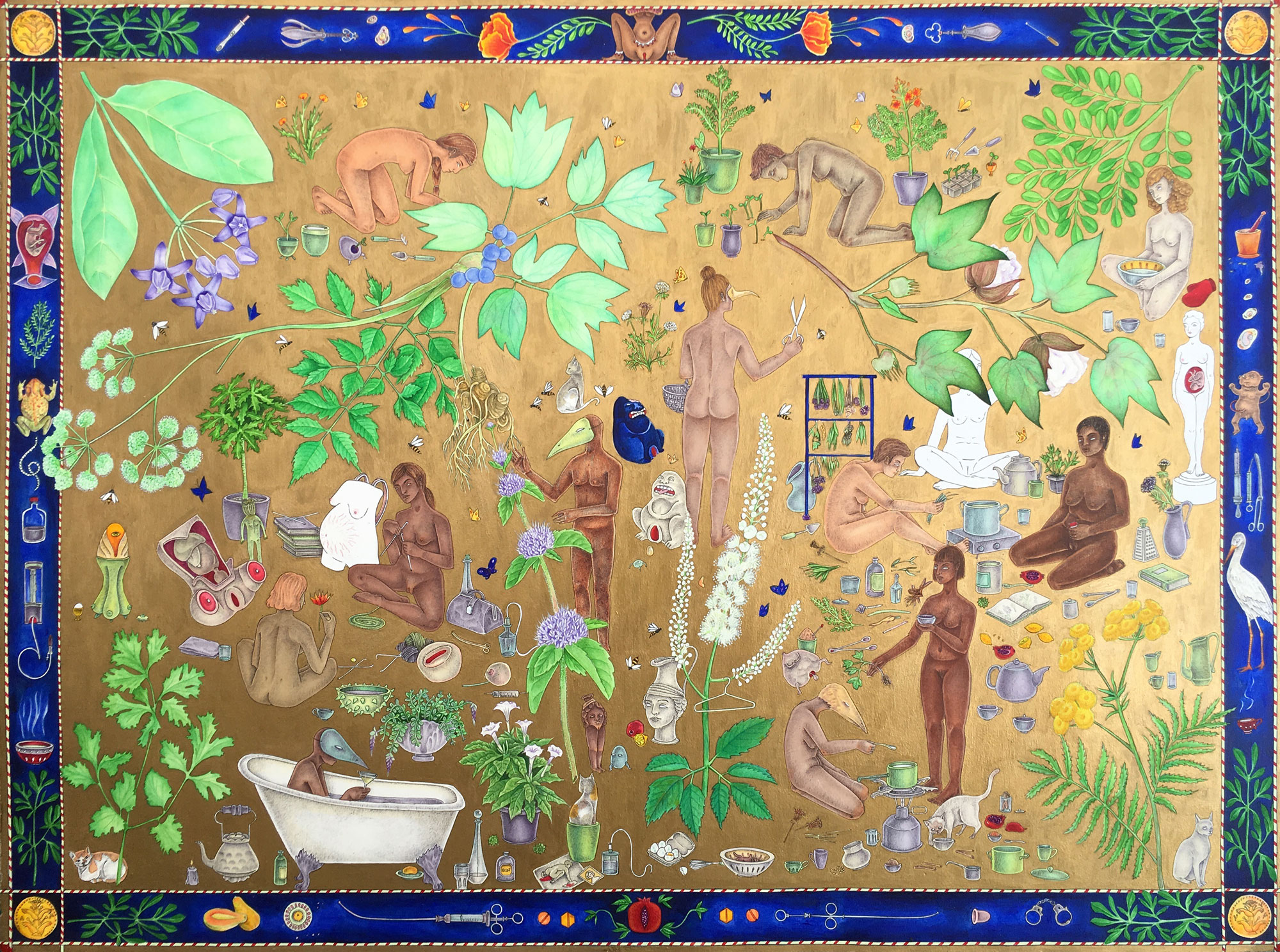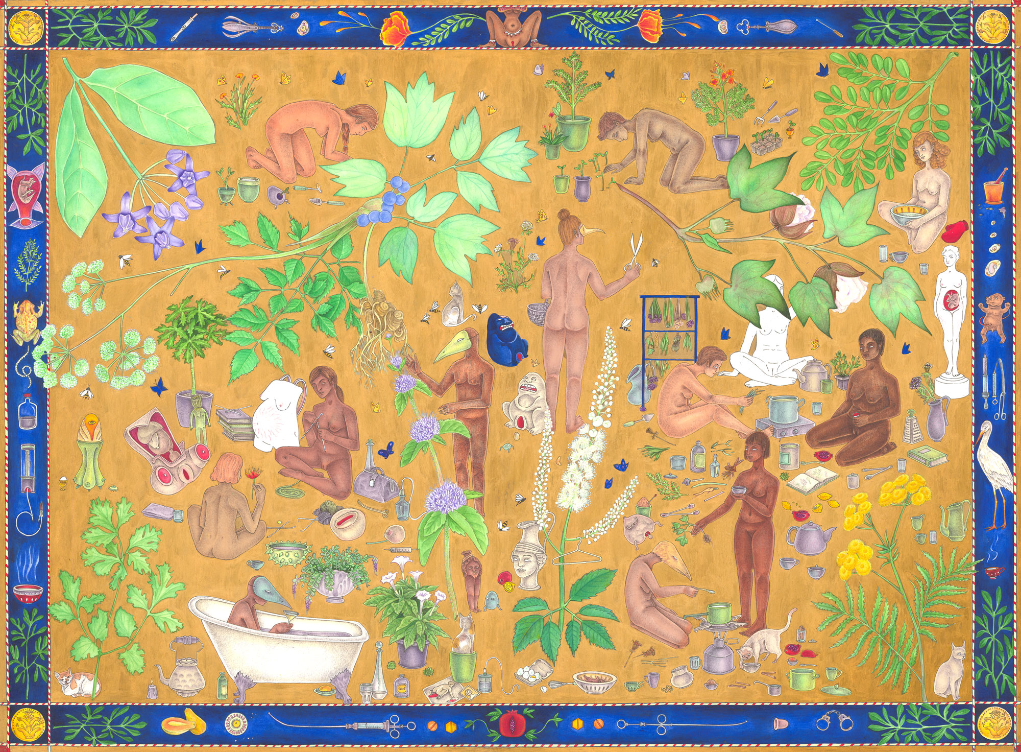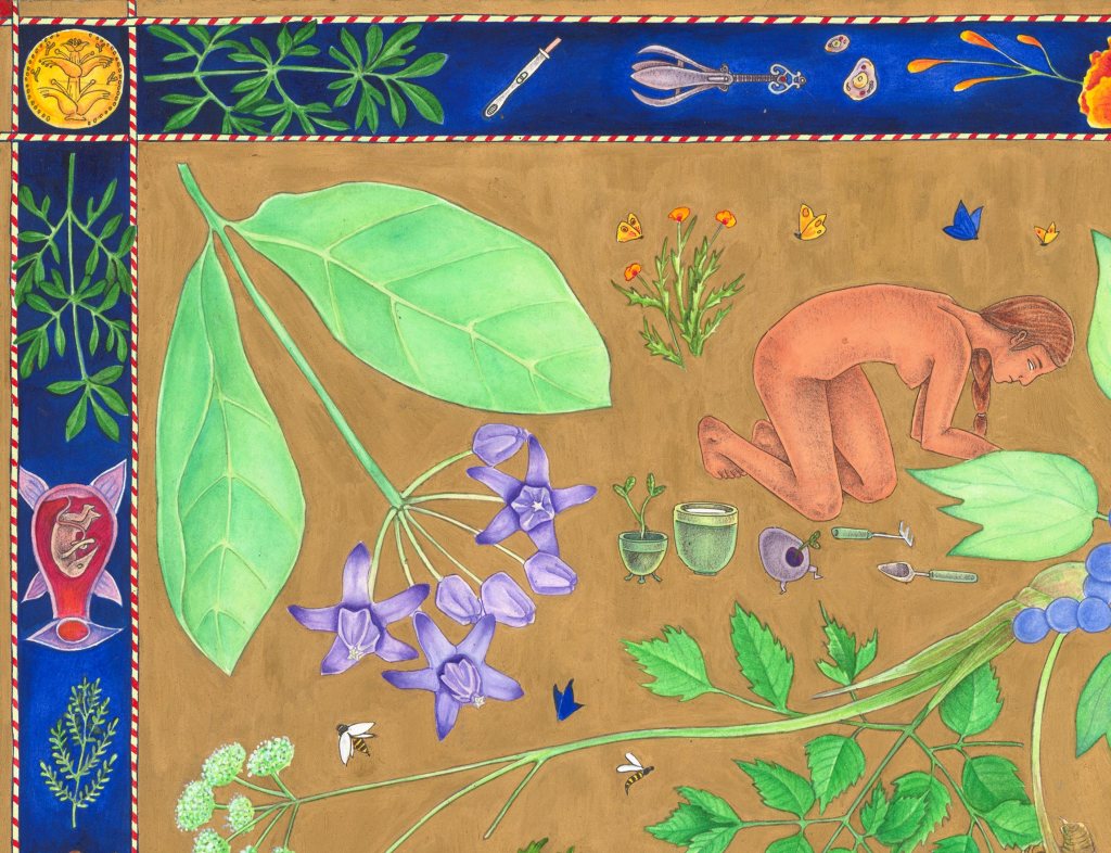 This painting is based on the medieval/Persian/Mughal tradition of painting medical treatments and medicinal herbs in paintings: Specifically celebrating and documenting some of the herbs and medical treatments for ‘women’s issues’ i.e. to induce a miscarriage for unwanted pregnancies.
