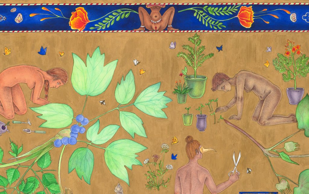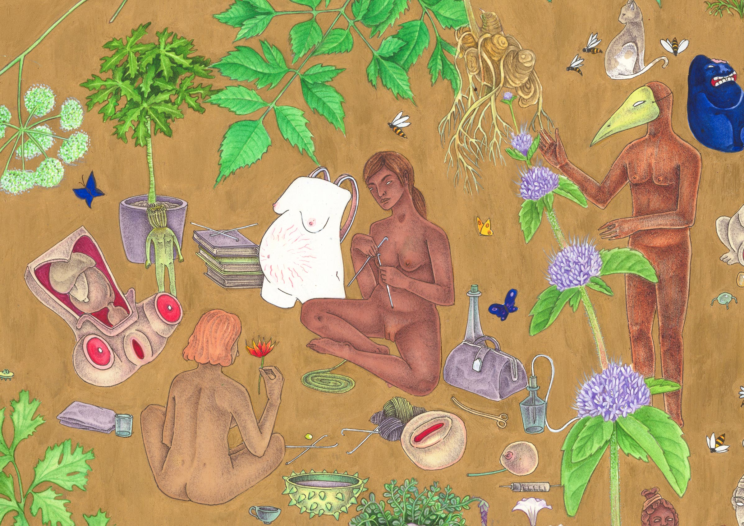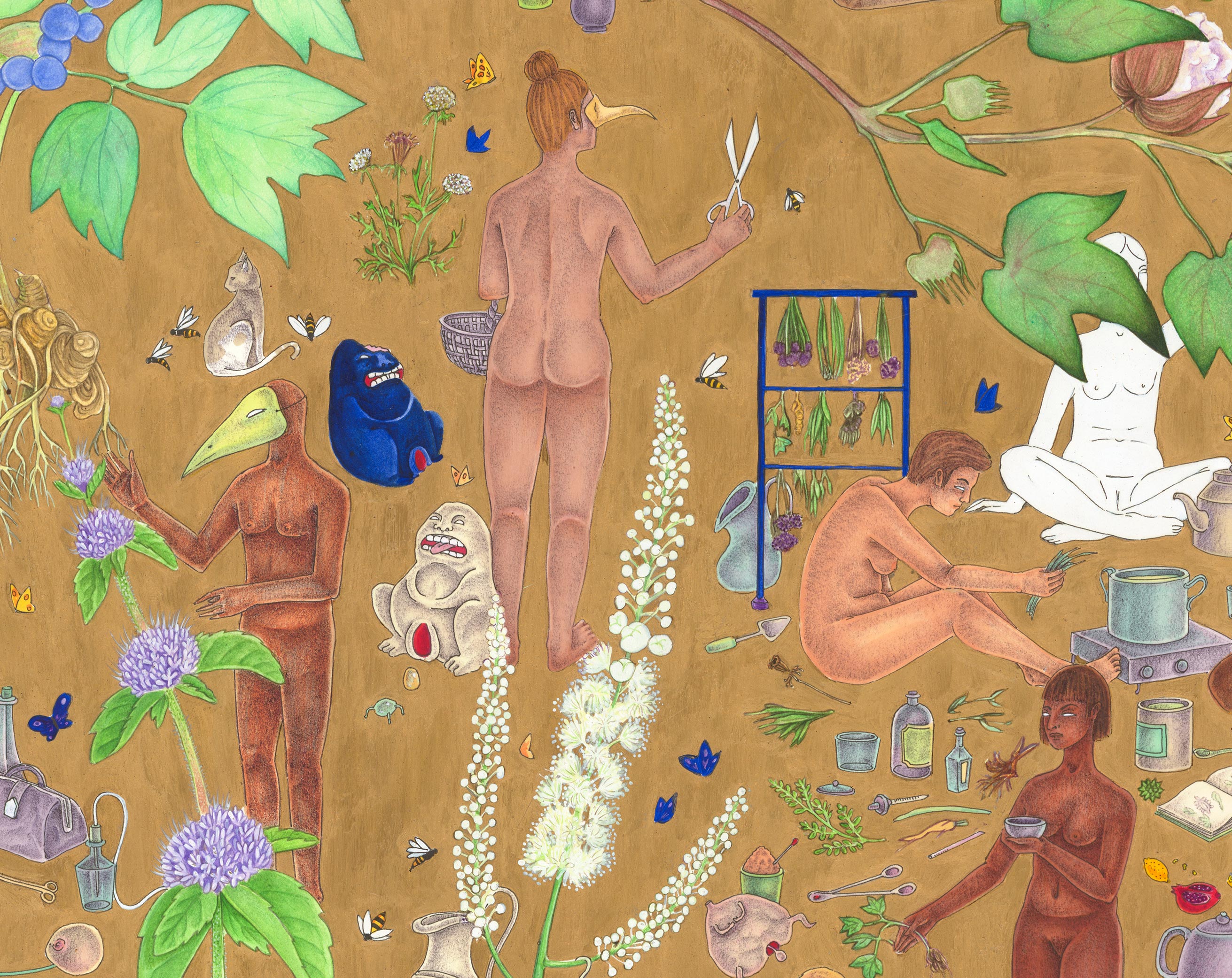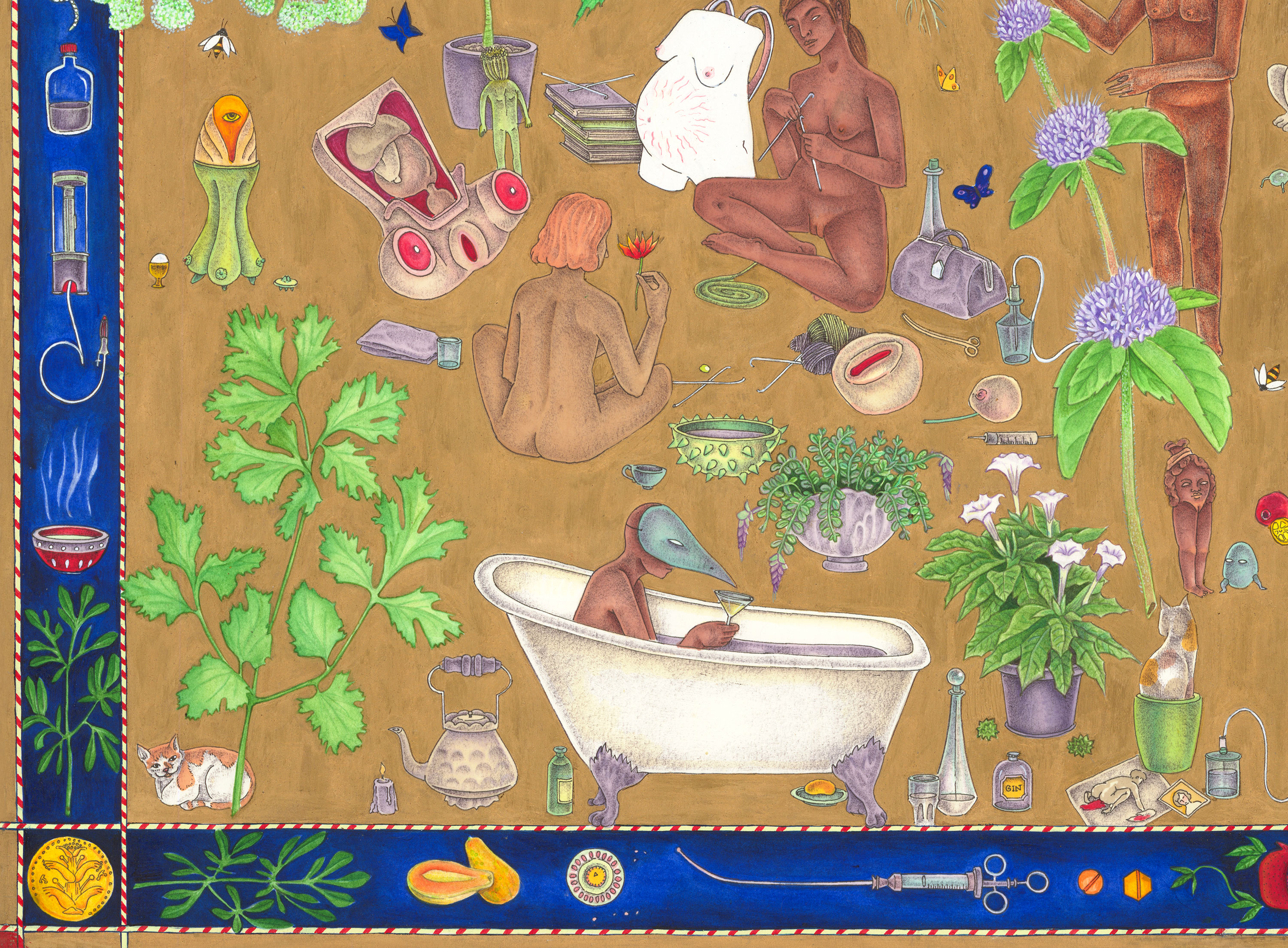 This painting is based on the medieval/Persian/Mughal tradition of painting medical treatments and medicinal herbs in paintings: Specifically celebrating and documenting some of the herbs and medical treatments for ‘women’s issues’ i.e. to induce a miscarriage for unwanted pregnancies.